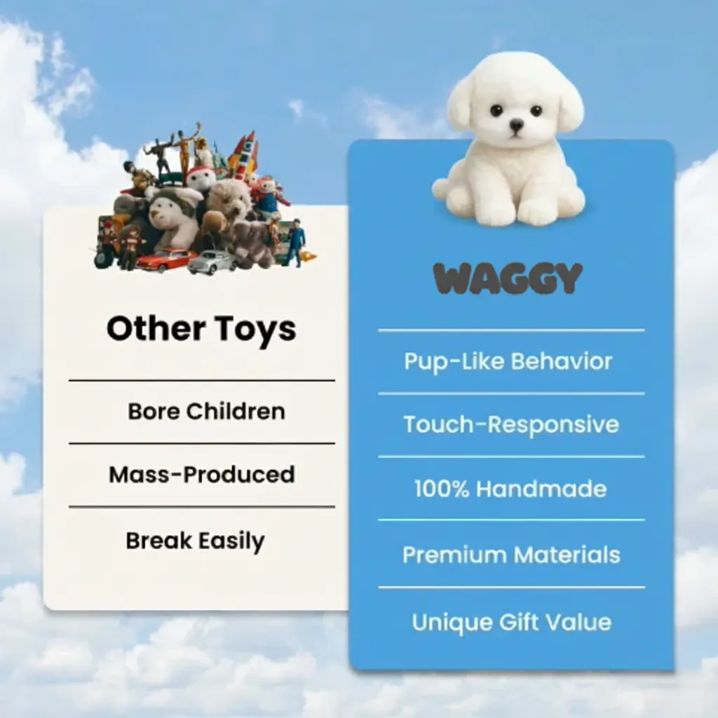Unlike mass-produced robotic pets, Waggy blends lifelike technology with artisanal design, creating an experience no other robotic puppy can match.